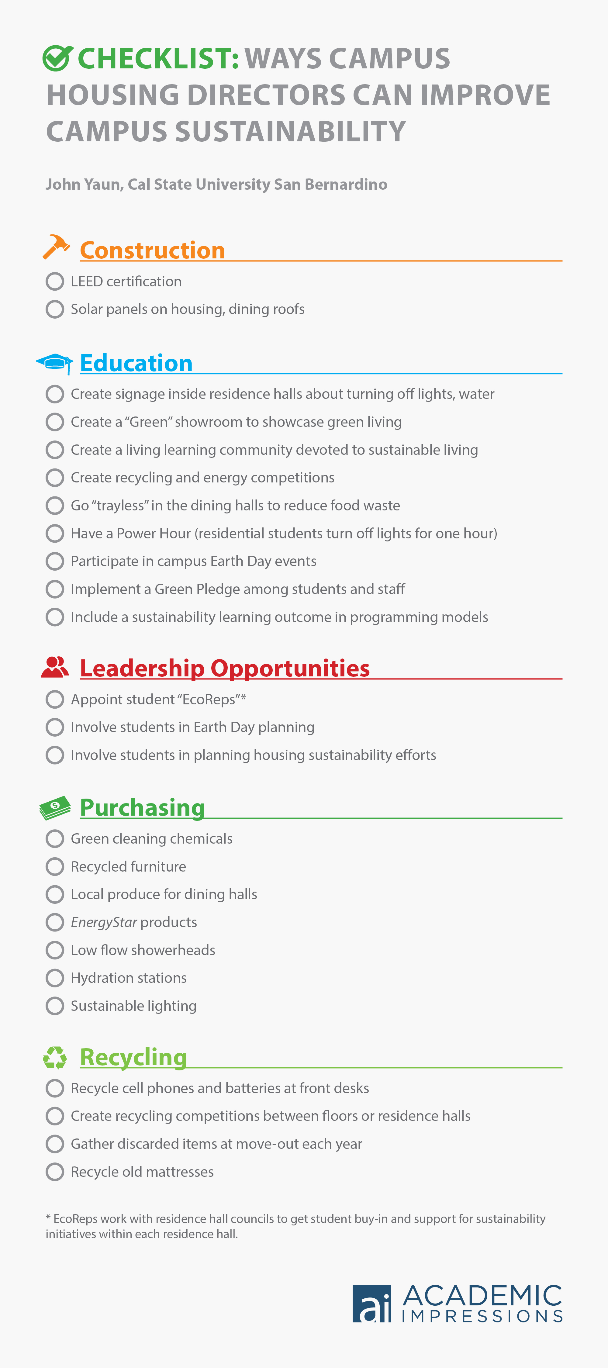 What could you do at your campus? Here is a checklist of ways in which campus housing directors can work to improve sustainability in construction, education, student leadership, purchasing, and recycling.