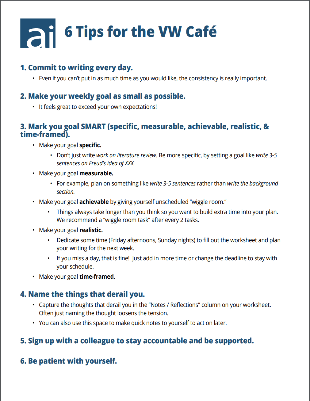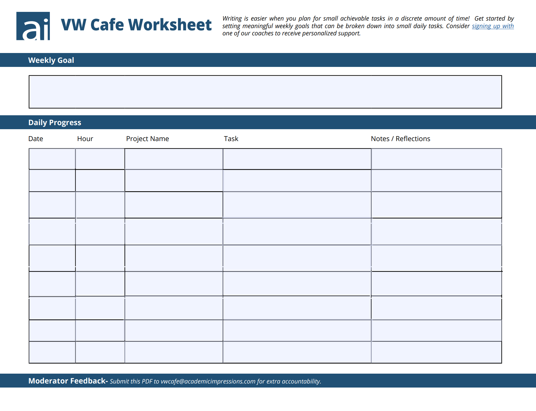 This fillable PDF will help you create a plan for maximizing your productivity in the VW Café.