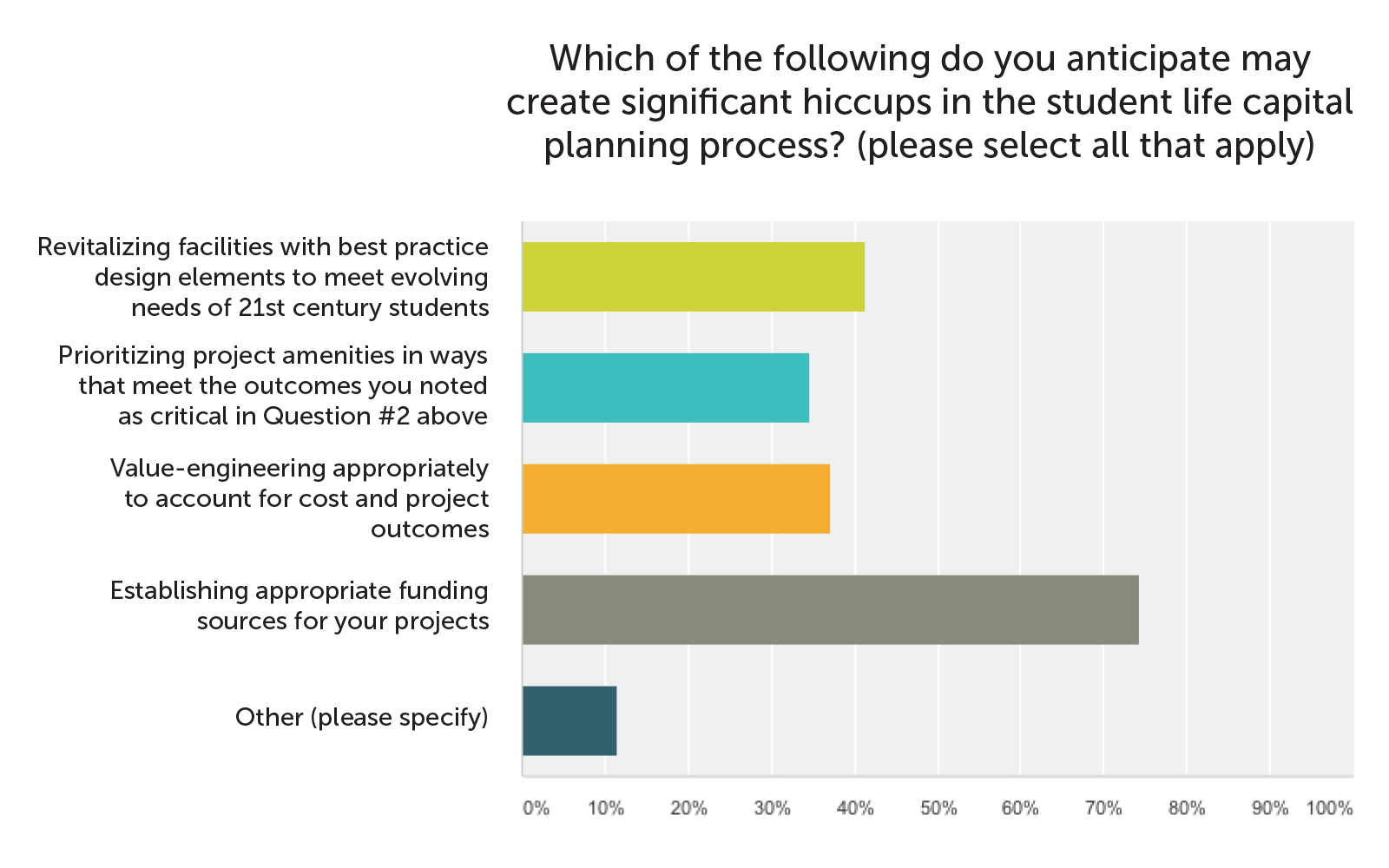 Overwhelmingly, respondents cited establishing sources of funding as the “most significant hiccup” anticipated in the student life capital planning process. The second largest anticipated challenge was identifying best practices in design to meet the needs of 21st century students.