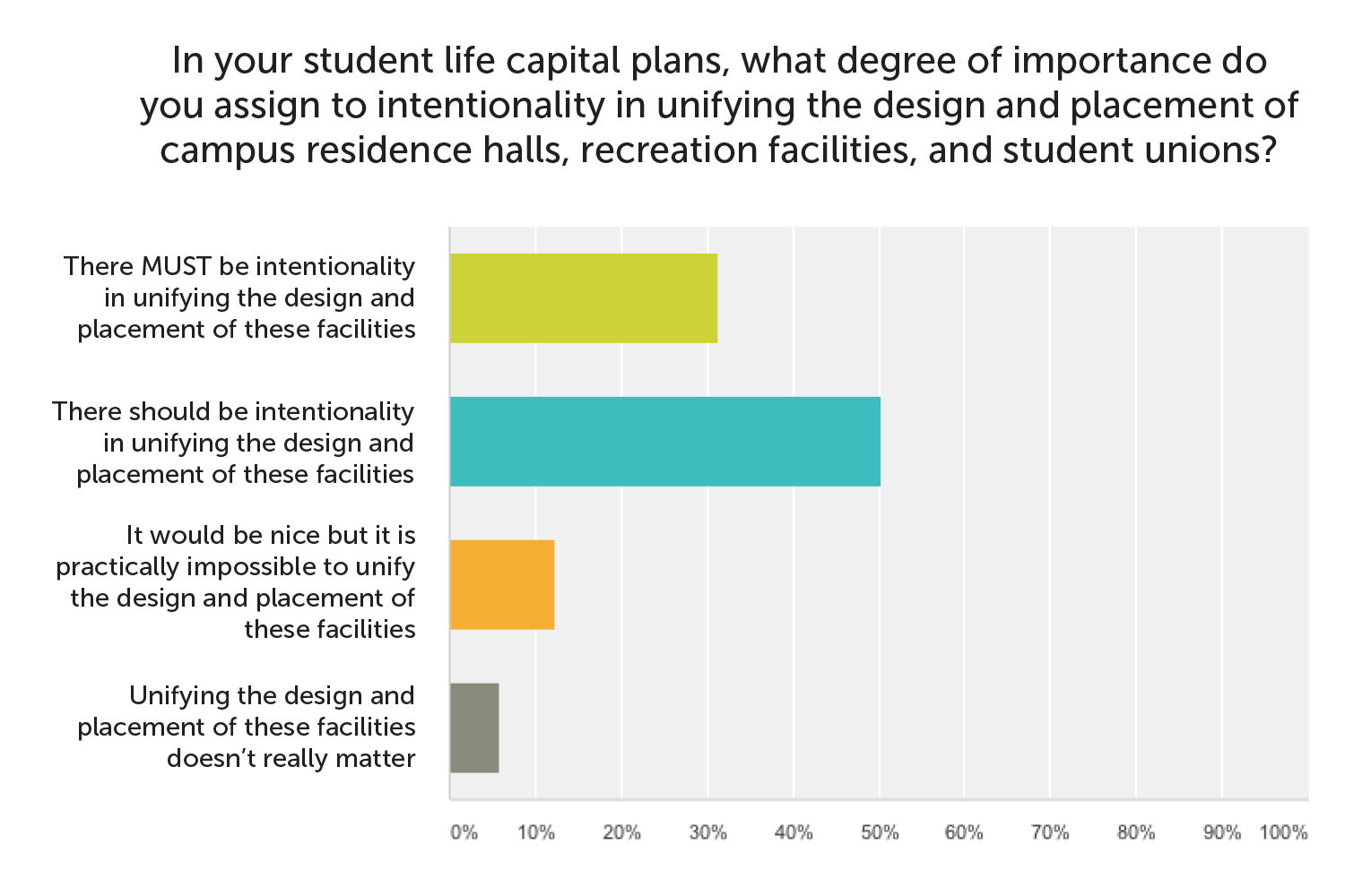 The survey validated that the push for a more intentional, unified approach to these facilities is a rising trend. When asked how important it was to unify the design and placement of student life facilities, 51% believed there must be intentional unity. Only 6% felt it didn’t matter.