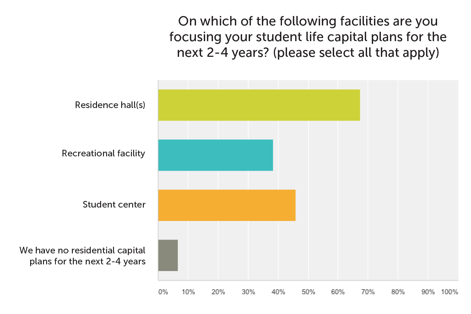 Earlier this year, we conducted a study of how institutions are planning for the design and placement of student life facilities over the next 12 months. Our study included: