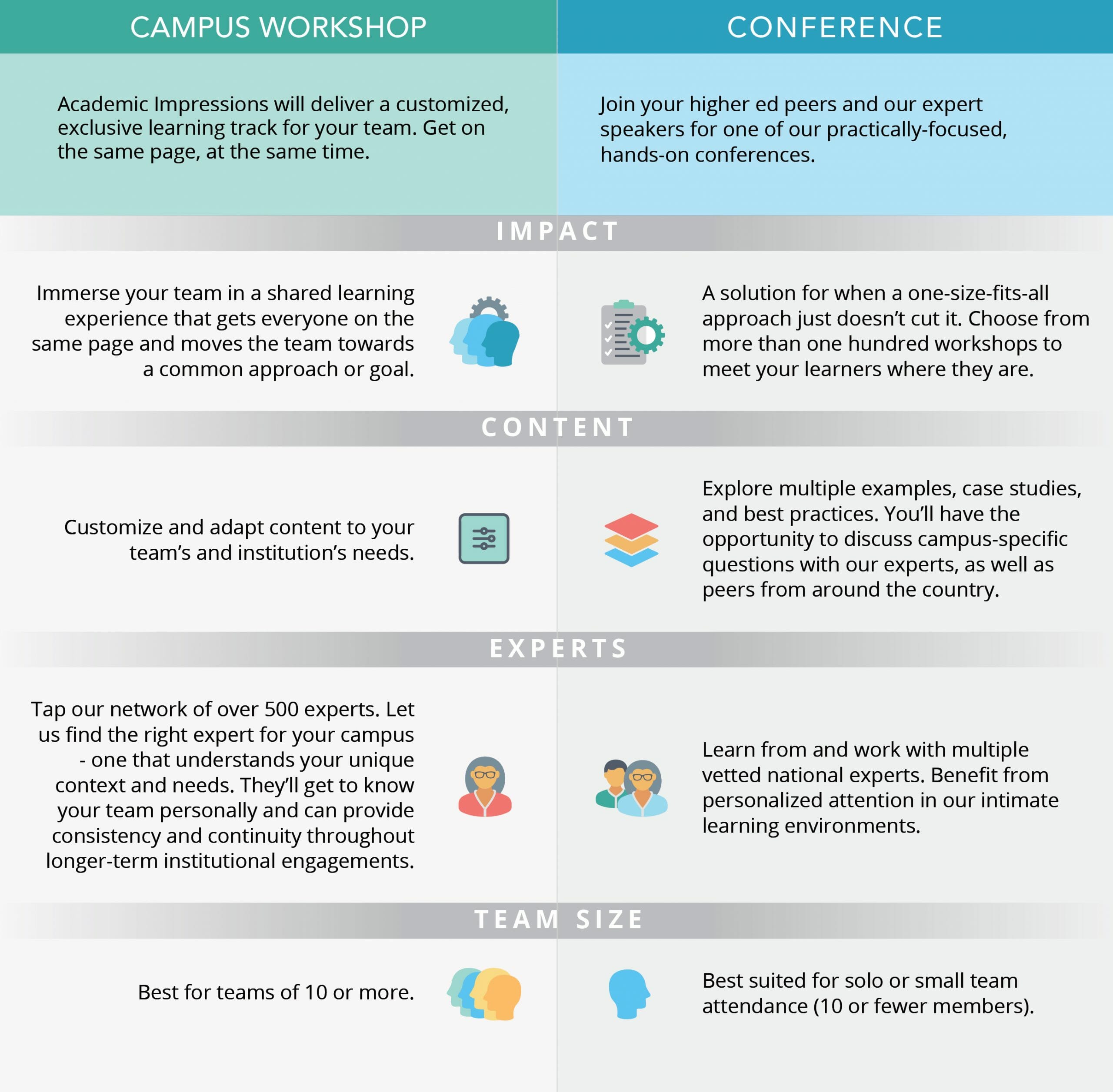 Complete the form below and an Academic Impressions Program Manager will follow up with you to discuss the campus workshop and options for your campus.
