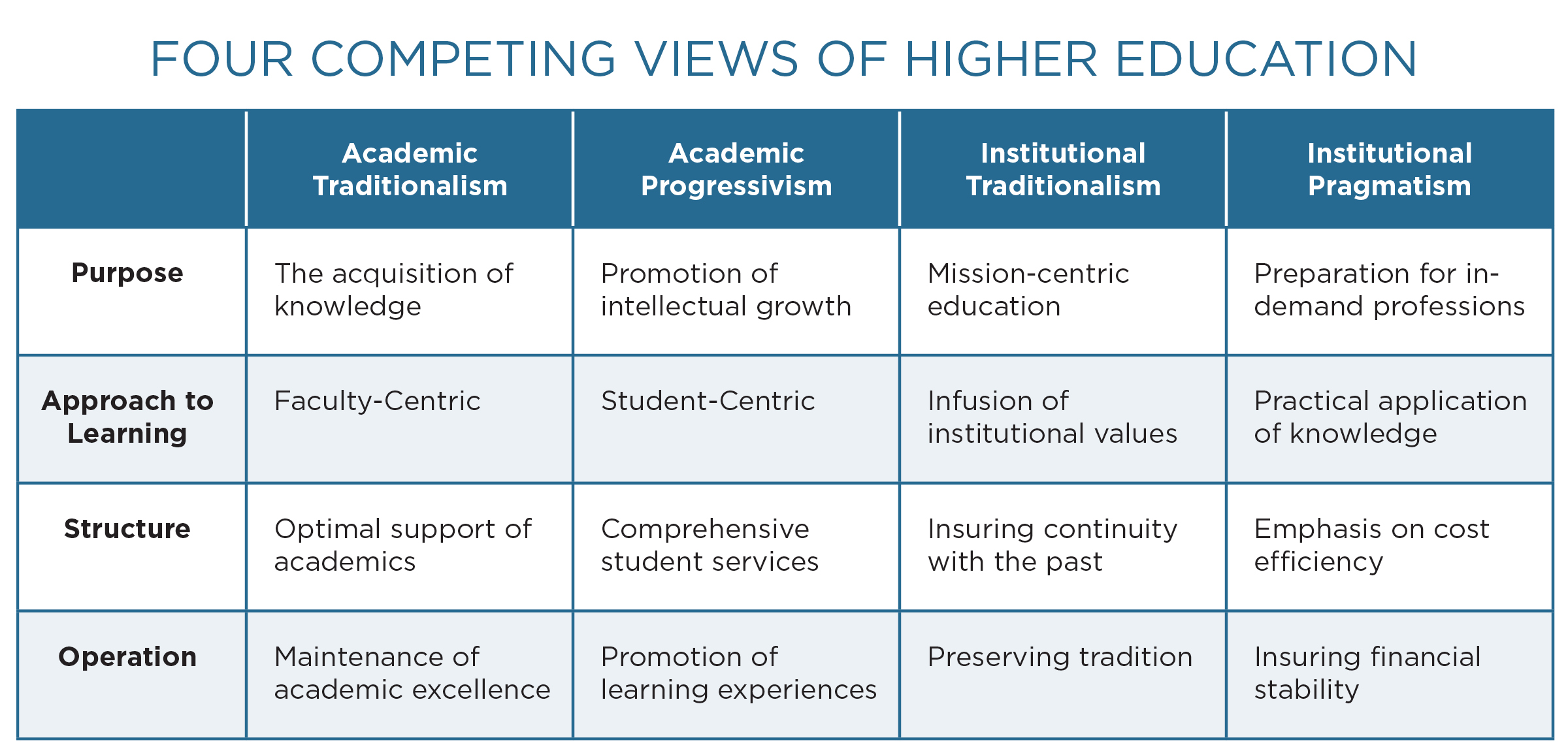 - Academic traditionalism, which sees college as a rigorous immersion into the intellectual world of the disciplines. In this view, the quality of faculty research and teaching determines the reputation of the institution.